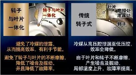 從上面的動態(tài)圖可以看出,轉(zhuǎn)子式壓縮機(jī)的轉(zhuǎn)子和葉片是分離的,那么在長期的運(yùn)轉(zhuǎn)下,就容易反復(fù)摩擦,不但容易產(chǎn)生噪音,甚至?xí)斐刹考p和冷媒泄露等問題,可能提升空調(diào)的故障率。